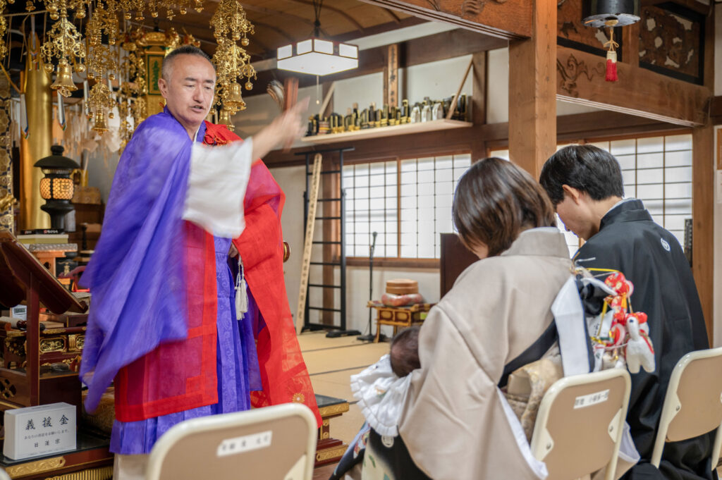 当日は、赤ちゃんに祝い着(のしめ)をかけ、家族みんなで神社を訪れます。神職によるお祓いや祝詞を受けることで、これからの人生が健やかで幸せなものとなるよう願います。参拝後は、境内や写真館などで記念撮影をすることが多く、祖父母や親戚と一緒に食事をしてお祝いすることもあります。